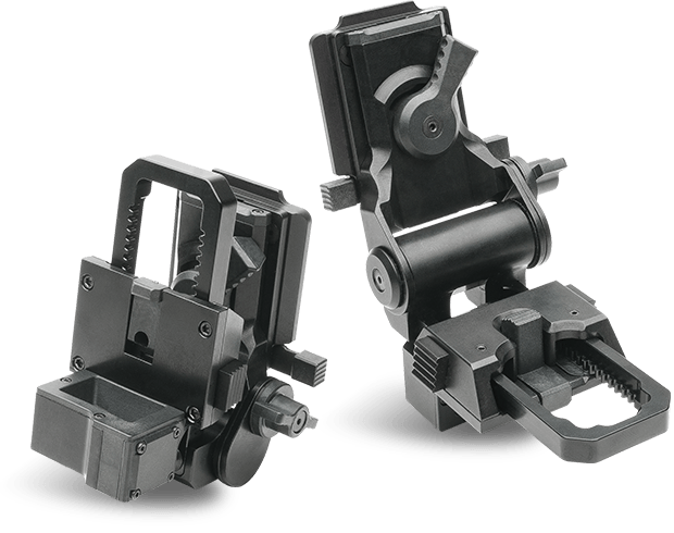 The G11 mount features several points of adjustment for proper fit and eye relief, and utilizes a force to overcome flip mechanism to stow the NVG when not in use. A horn interface provides firm attachment of the AN/PVS-7 and AN/PVS-14, with currently fielded AN/PVS-14 arm, to a variety of combat helmets. Mount/shroud kits available.